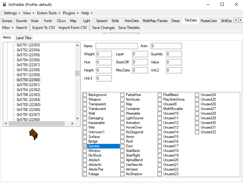 Tipp: Man sollte sich ähnliche Items ansehen, um die richtigen Flags dafür zu sehen. Die Flags werden auch im Items Tab angezeigt, wenn man ein Item anklickt. Eine Kleine Übersicht von Flags: Weapon = Waffe, Rüstung und Kleidung Wall = Wände Damaging = verursacht Schaden? Impassable = Unpassierbar Surface = Oberfläche, Tische, Treppen Window = Fenster Bridge = Brücke Foliage = Blattwerk vom Baum PartialHUE = Teilweise Färbbar z.B Narrenhemd Container = Behälter Wearable = Tragbares item wie z.B. Ohrringe LightSource = Lichtquelle Roof = Dach Door = Tür